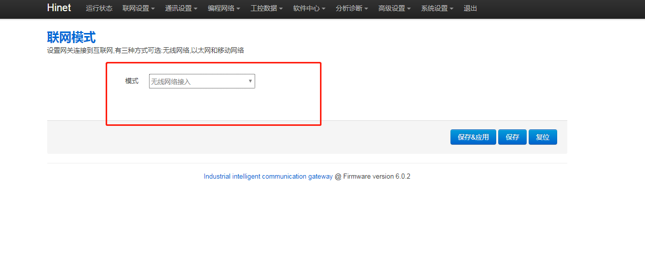 1. 网关后台联网模式是否正确,进网关后台,点击“联网设置 - 联网模式”,修改模式为“无线网络接入”,再点击【保存应用】,重启网关生效。
