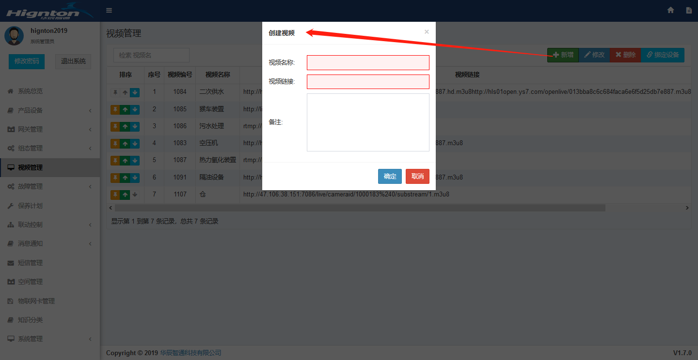 进入思普云,点击【视频管理】,点击【新增】,视频名称自定义填写,将萤石开放平台上复制的链接粘贴到视频链接,点击确定,